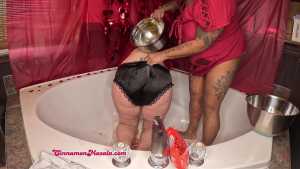 This scene is part of the girls' Valentine's video shoot, this one has Masala pouring raw eggs into Cinnamon's silky black panties.