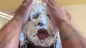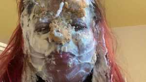 She enjoys two banana cream pies wearing a red sexy teddy! Red definitely looks great on her, as well as pie!