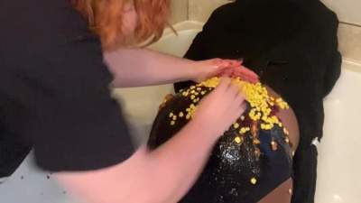 Masala decides to go fully nude in this scene. She pours matcha from a glass pitcher over her shoulder all the way down to her ass! She then starts to sprinkle bits of candy cane but it doesn't quite work as she had hoped! We forgive her though, don't we?